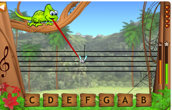 Rhythmic Village - This purely focuses on the rhythm/note lengths rather than pitch. The introduction to each task uses American terminology e.g. quarter notes for crochets etc. However, I think it appropriate and supportive if the basics have been covered in the lesson or by a knowledgeable adult at home.